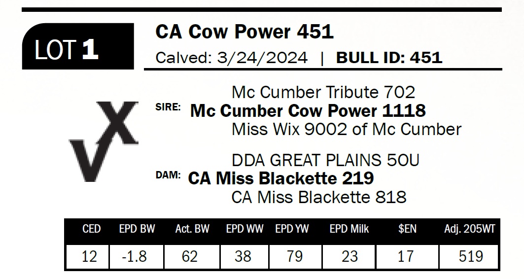 | CA Cow Power 451 | 1 | Two-Year Old Bull | *** Calving ease. Heifer Bull. Balanced, correct-made bull from a promising young cow. This bull was used on commercial heifers. |