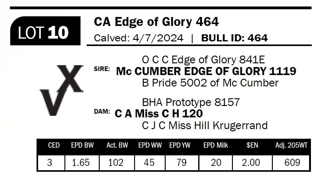 | CA Edge of Glory 464 | 10 | Two-Year Old Bull | Long-bodied, smooth-fronted bull with a bit more frame |