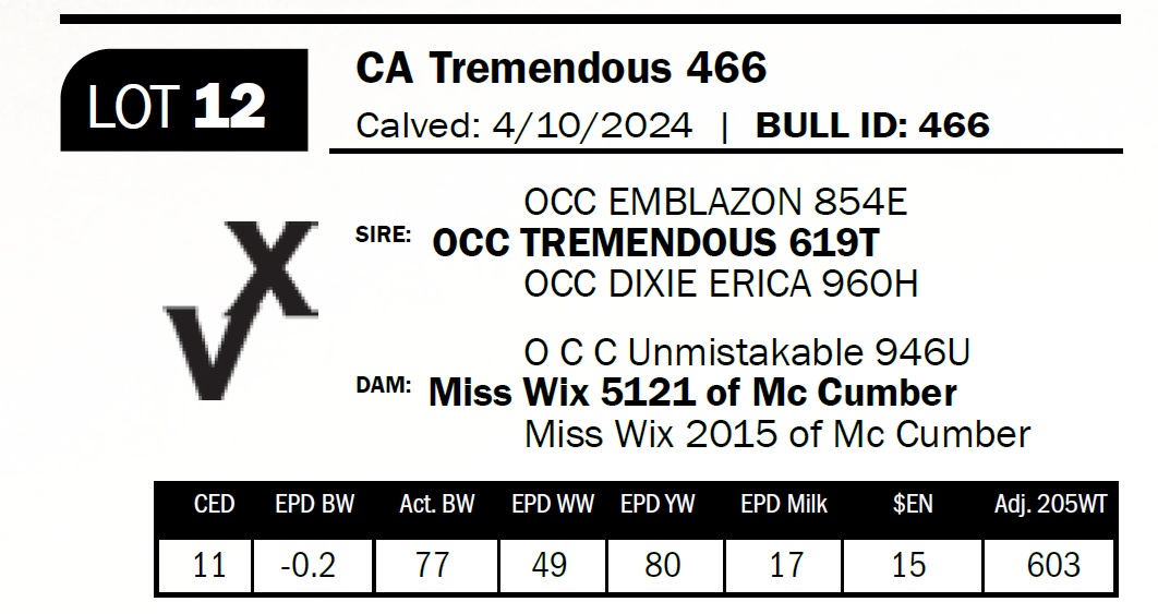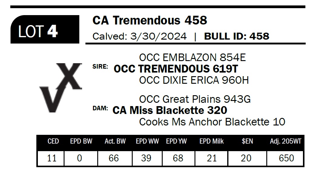 | CA Tremendous 458 | 4 | Two-Year Old Bull | *** Calving ease. Heifer bull. Tremendous son from a top cow. Carries the classic OCC phenotype with depth, thickness, and substance. |