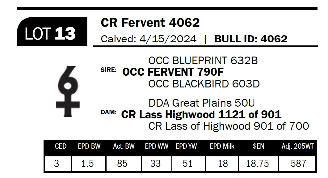 | CR Fervent 4062 | 13 | Two-Year Old Bull | OCC bred and looks the part. Deep, soggy-made bull with plenty of body. |