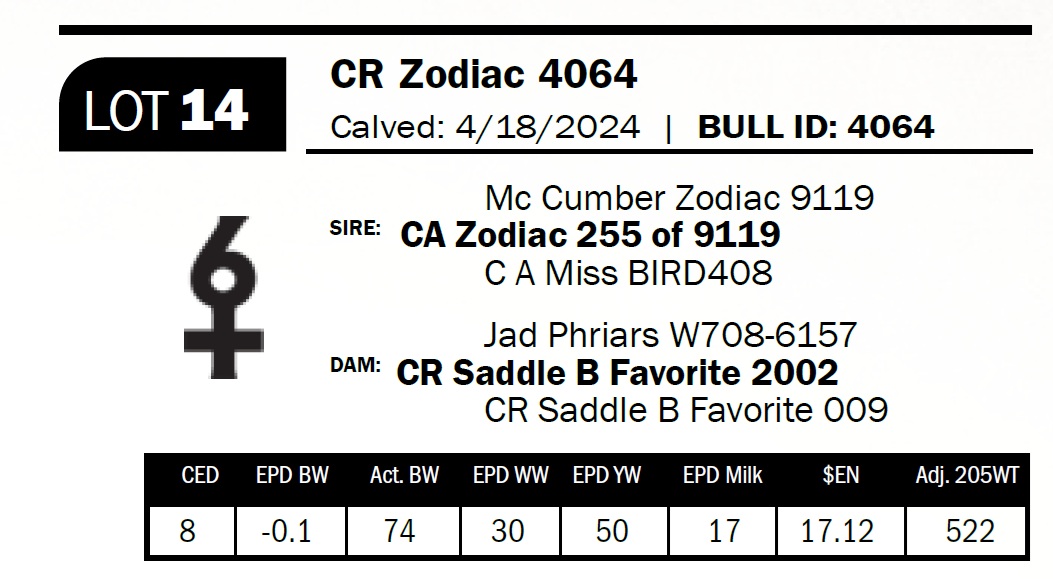 | CR Zodiac 4064 | 14 | Two-Year Old Bull | *** Calving ease. Heifer Bull. Straight, correct, smooth-made bull with heifer-bull potential. Used on commercial heifers |