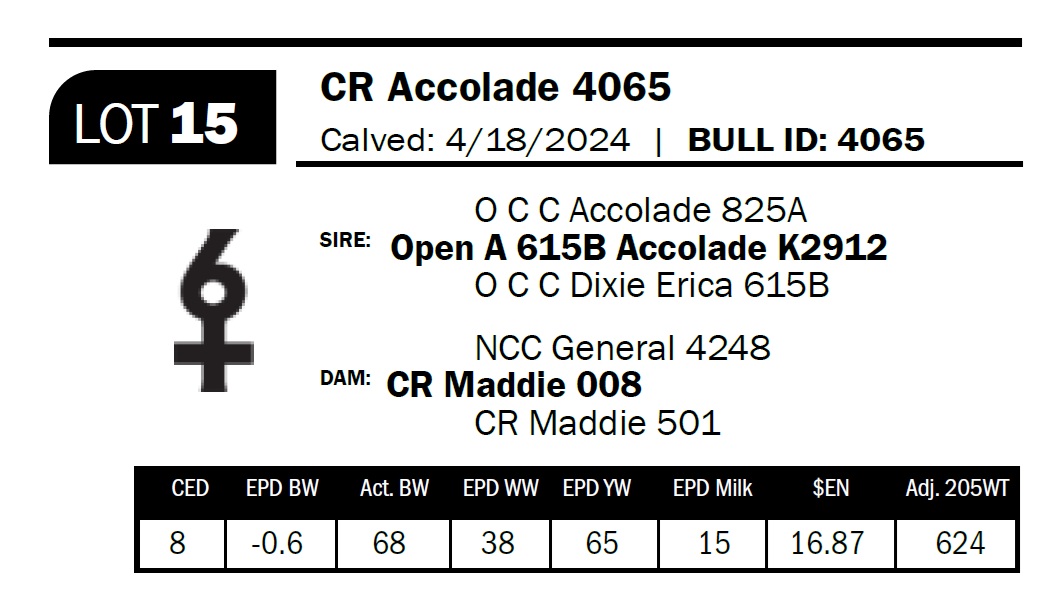 | CR Accolade 4065 | 15 | Two-Year Old Bull | OCC bred and consistent in type. Deep, thick bull with a nice muscle pattern |
