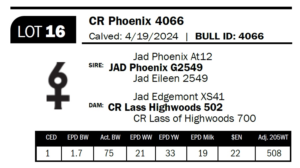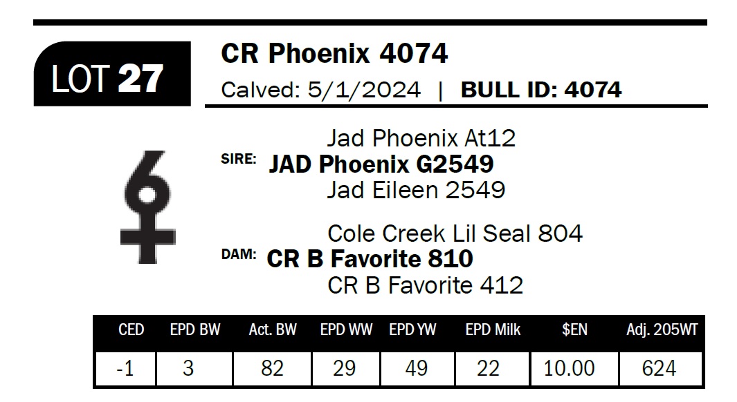 | CR Phoenix 4074 | 27 | Two-Year Old Bull | Another JAD G2549-sired bull out of a really nice cow. These 94 sons are “peas in a pod” offering consistency and the chance to retain several half-brothers that will produce replacement-type females. |