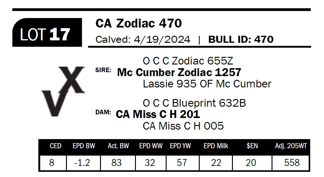 | CA Zodiac 470 | 17 | Two-Year Old Bull | *** Calving ease. Long, smooth-made bull with heifer-bull potential. |