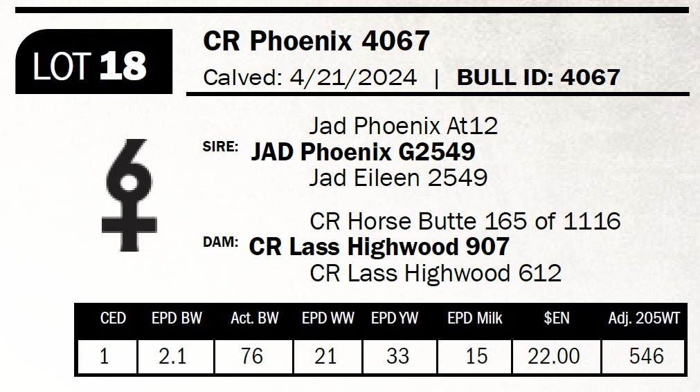 | CR Phoenix 4067 | 18 | Two-Year Old Bull | Sired by the Shoshone bull JAD G2549, noted for his structure, length, depth, and bone. His daughters are proving themselves as feminine, sound-made cows with good feet and udders. 4067 is long and refi ned with possible heifer-bull use. |