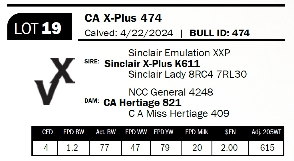 | CA X-Plus 474 | 19 | Two-Year Old Bull | Rancher’s kind of bull–big, deep, and long. Will add pounds and performance to your steer calves. |