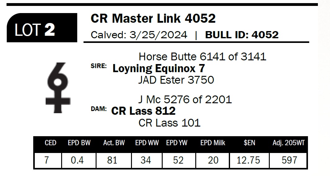 | CR Master Link 4052 | 2 | Two-Year Old Bull | Powerfully made Equinox son–long, deep-bodied, and out of a solid, reliable cow. |