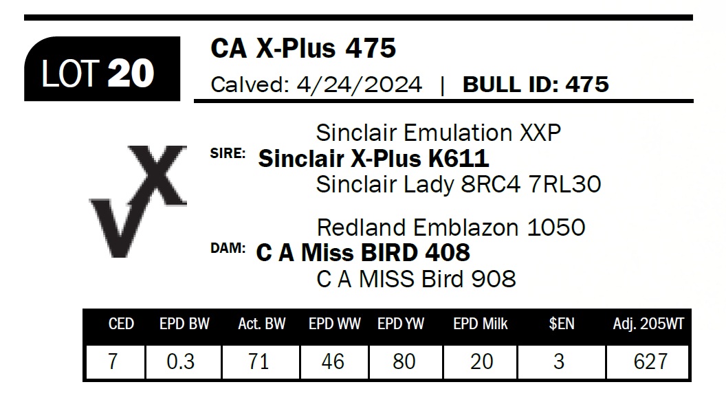 | CA X-Plus 475 | 20 | Two-Year Old Bull | Moderate-framed cow bull with style and shape. Half-brother to our 255 herd sire. His dam, 408, will be 12 this spring and consistently calves on time, raising keeper-quality offspring. This year’s heifer calf has been selected for the girls’ 4-H heifer pen. |