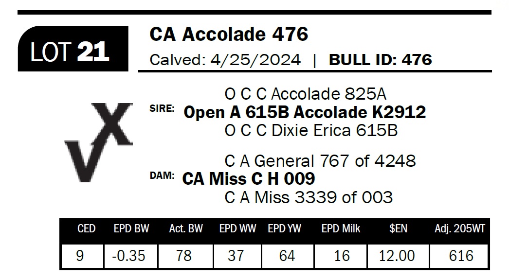 | CA Accolade 476 | 21 | Two-Year Old Bull | Sired by an Open A Angus bull, this bull combines length, natural muscle, and solid bone in a balanced package. |