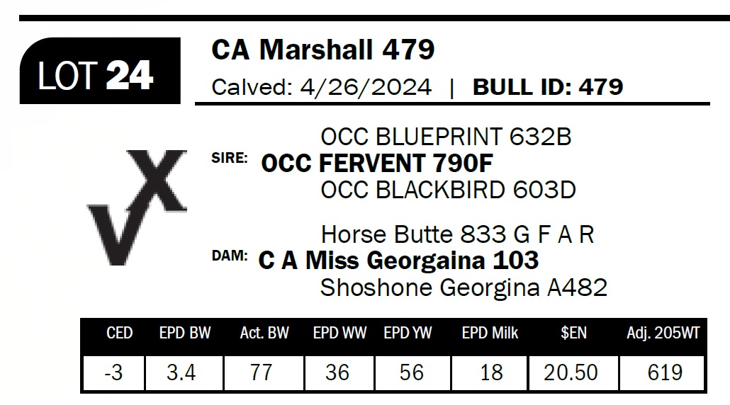| CA Marshall 479 | 24 | Two-Year Old Bull | This bull could be the highlight of our bull sale. He combines style and shape perfectly for a future herd bull. He was our top pick to keep until we changed our minds to retain another bull. His dam is our lead cow in our ET program. 103 has left an everlasting impression in our program. |