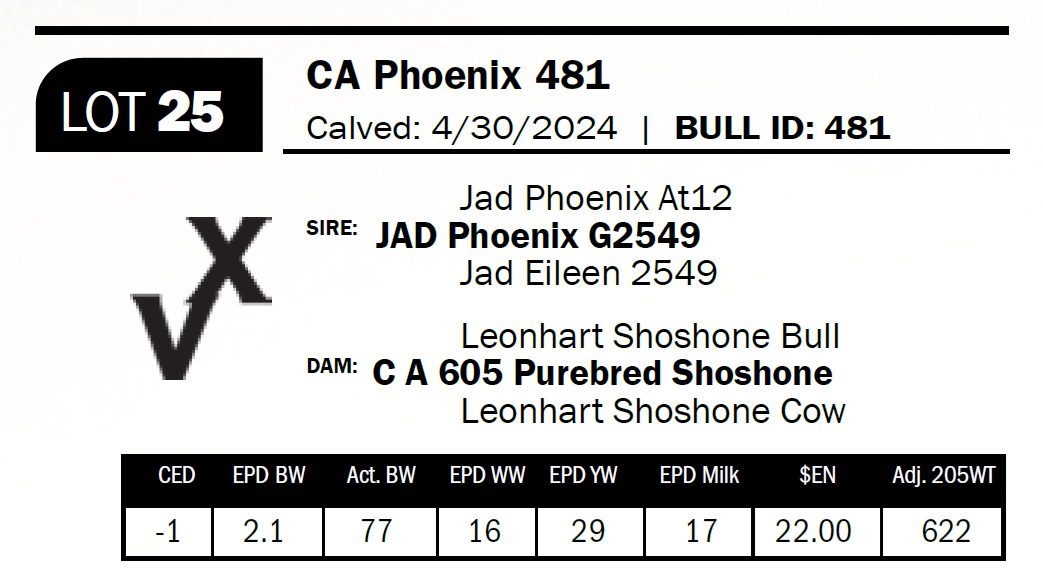 | CA Phoenix 481 | 25 | Two-Year Old Bull | Sells Commercial. Long, clean-fronted bull with a straight top and attractive head. Out of a solid nine-year-old cow. |