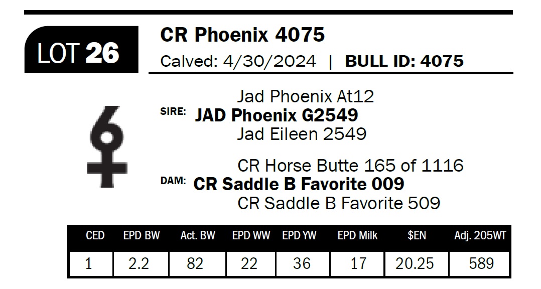 | CR Phoenix 4075 | 26 | Two-Year Old Bull | Sired by Shoshone G2549–proven genetics in a consistent package. |