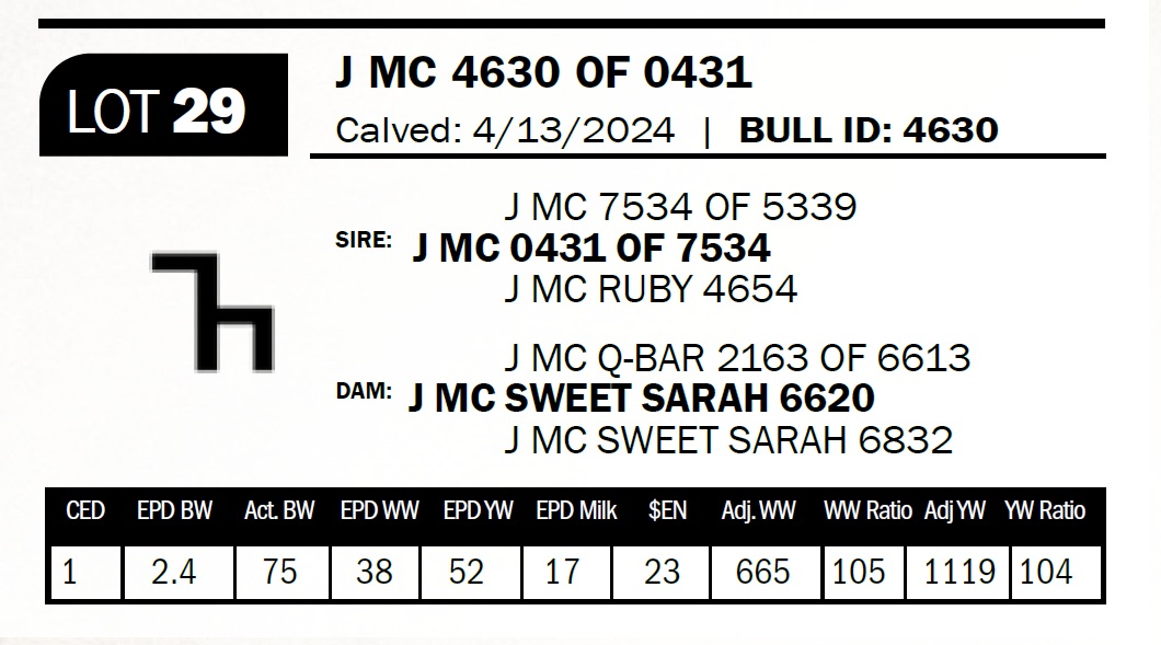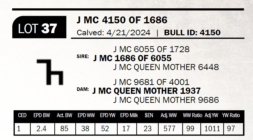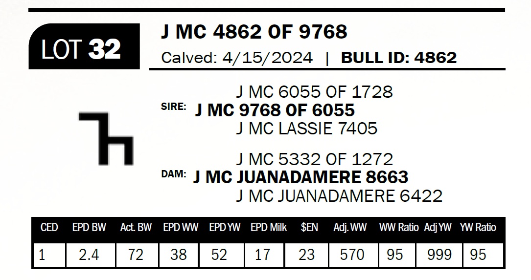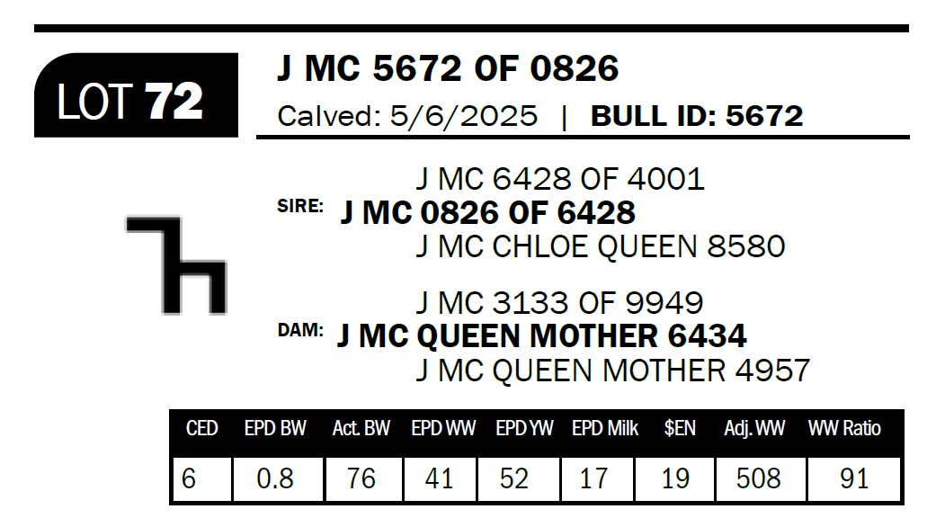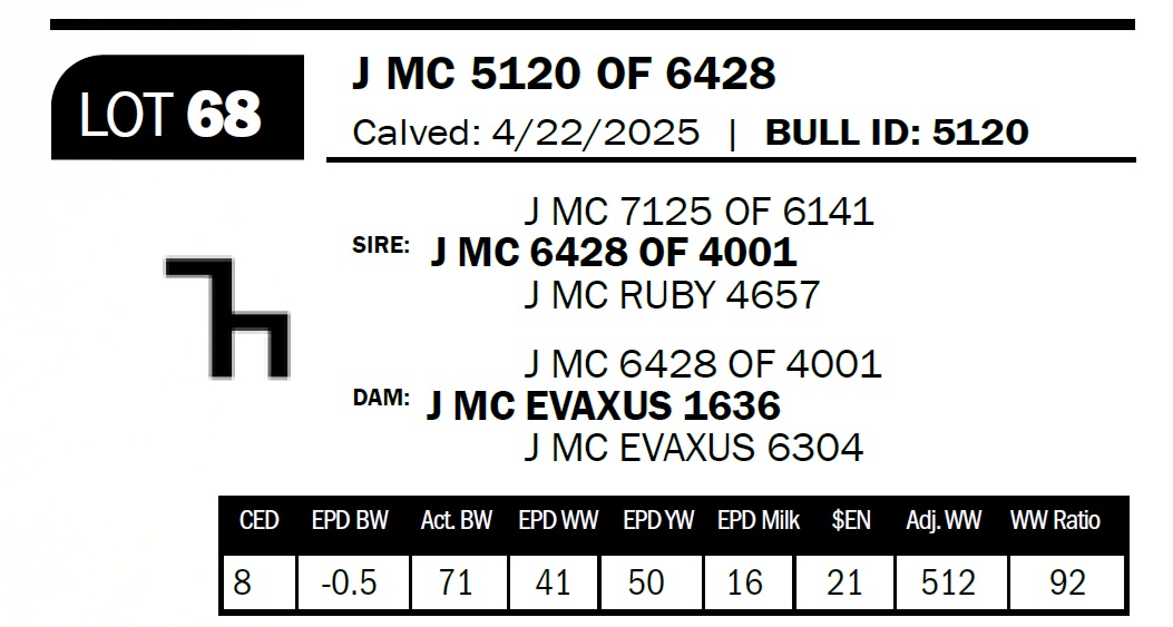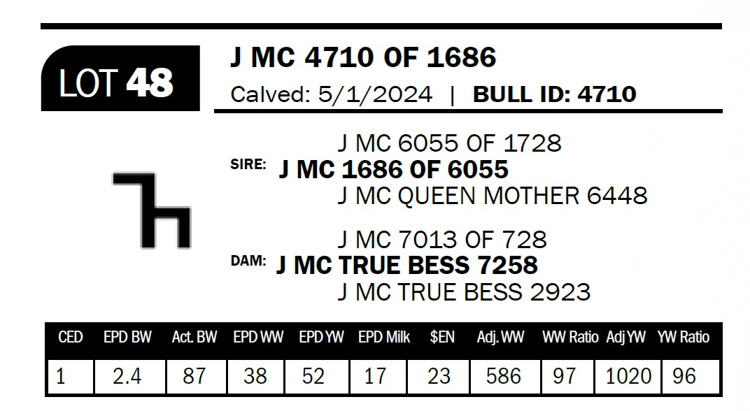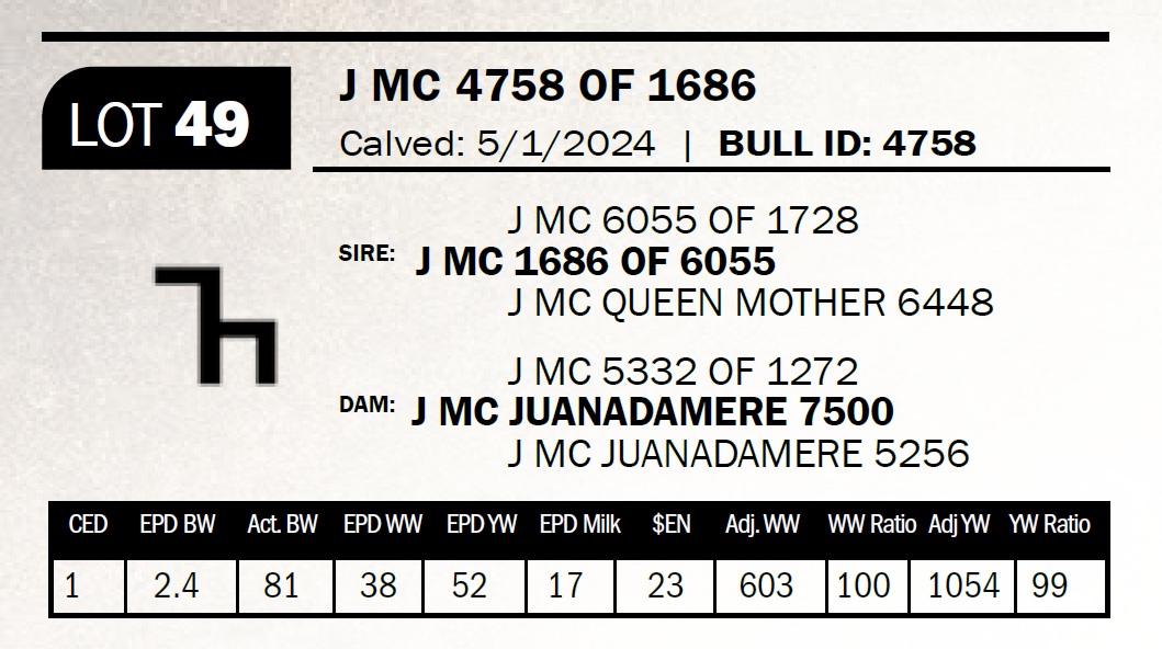 | J MC 4758 OF 1686 | 49 | Two-Year Old Bull | The 7 brand cows are proving to be some of our most consistent producers. This bull is out of a daughter that combines the 1272 and the 2943 bulls. |