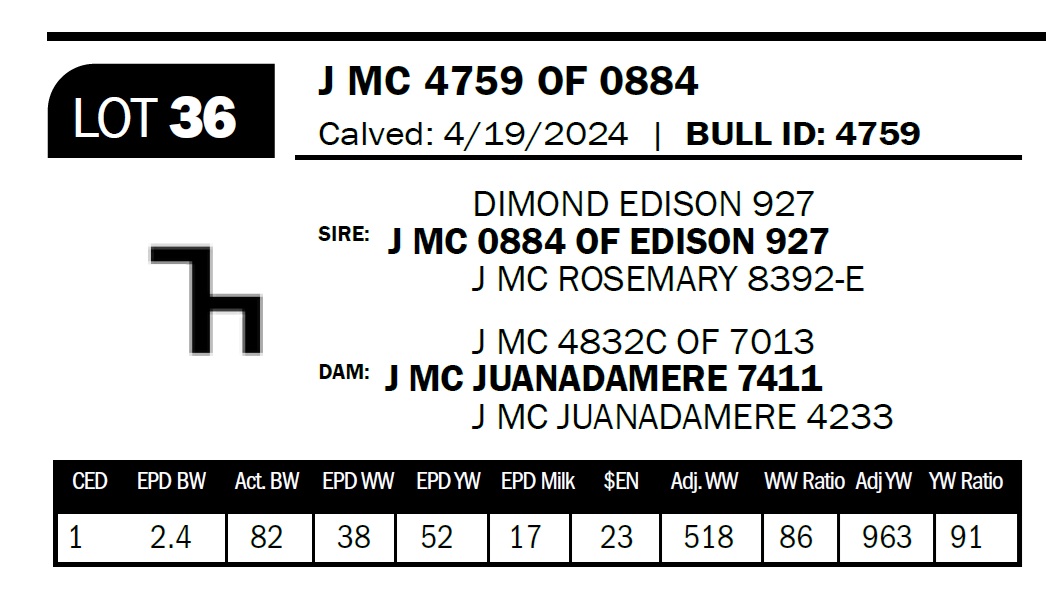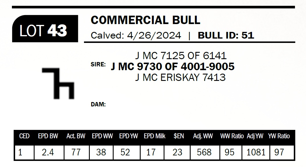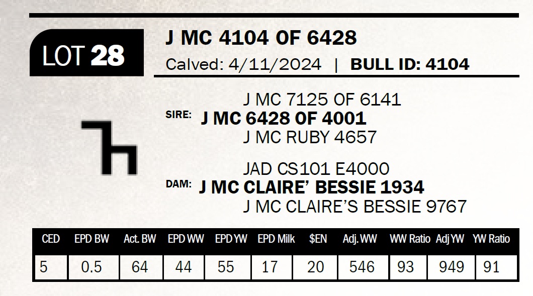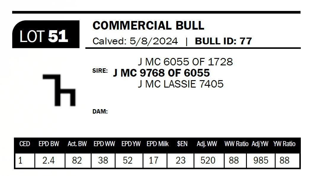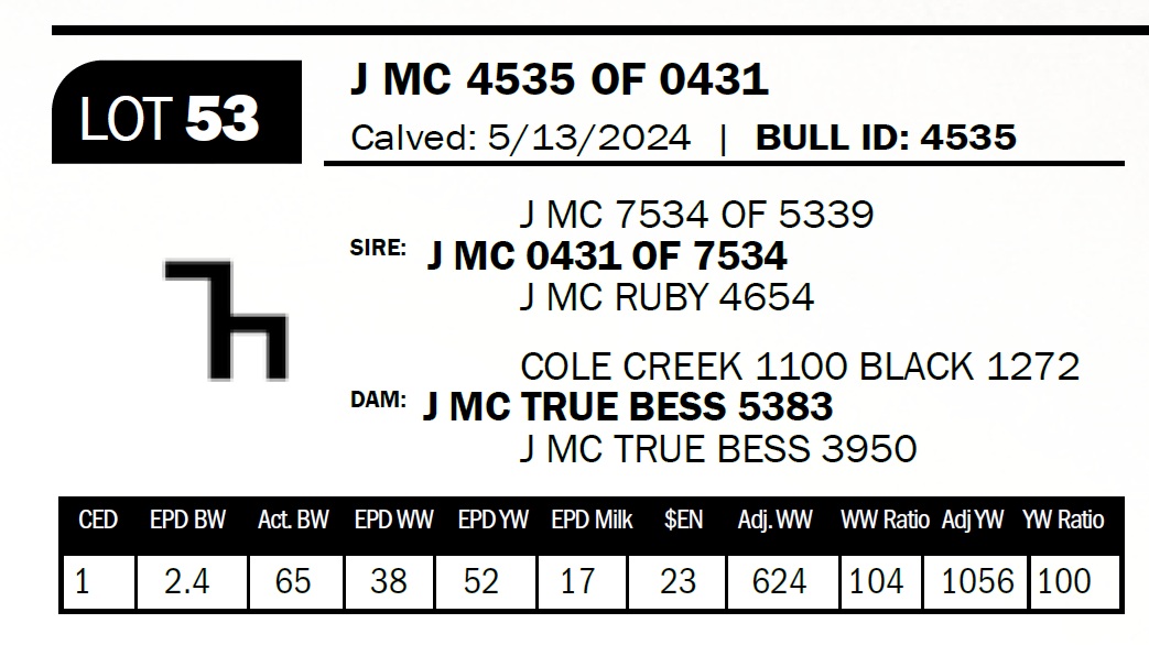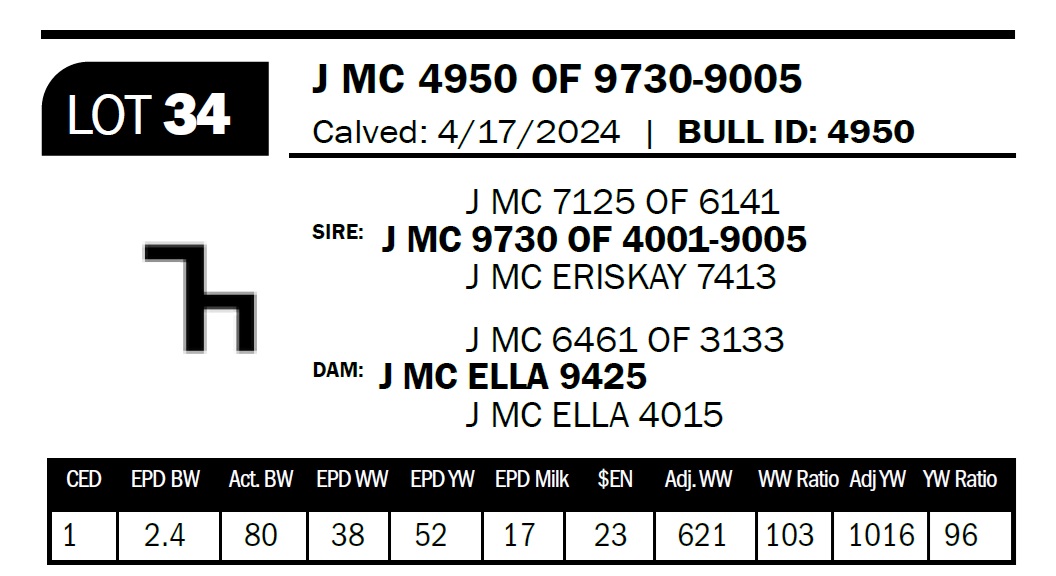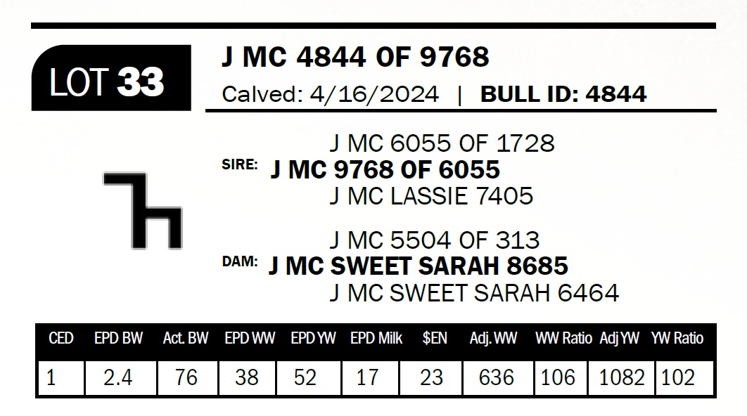 | J MC 4758 OF 1686 | 49 | Two-Year Old Bull | The 7 brand cows are proving to be some of our most consistent producers. This bull is out of a daughter that combines the 1272 and the 2943 bulls. |