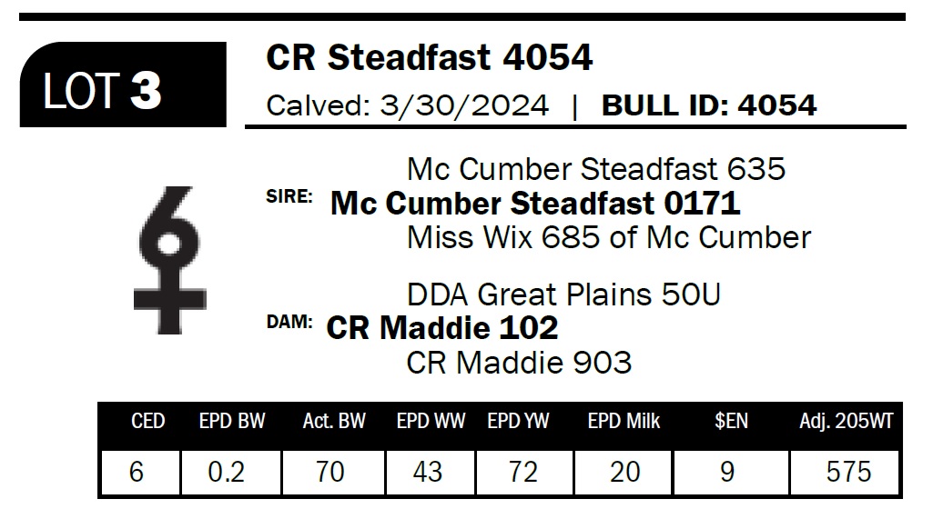| CR Steadfast 4054 | 3 | Two-Year Old Bull | Long, deep, and square-made bull with a powerful, balanced build |