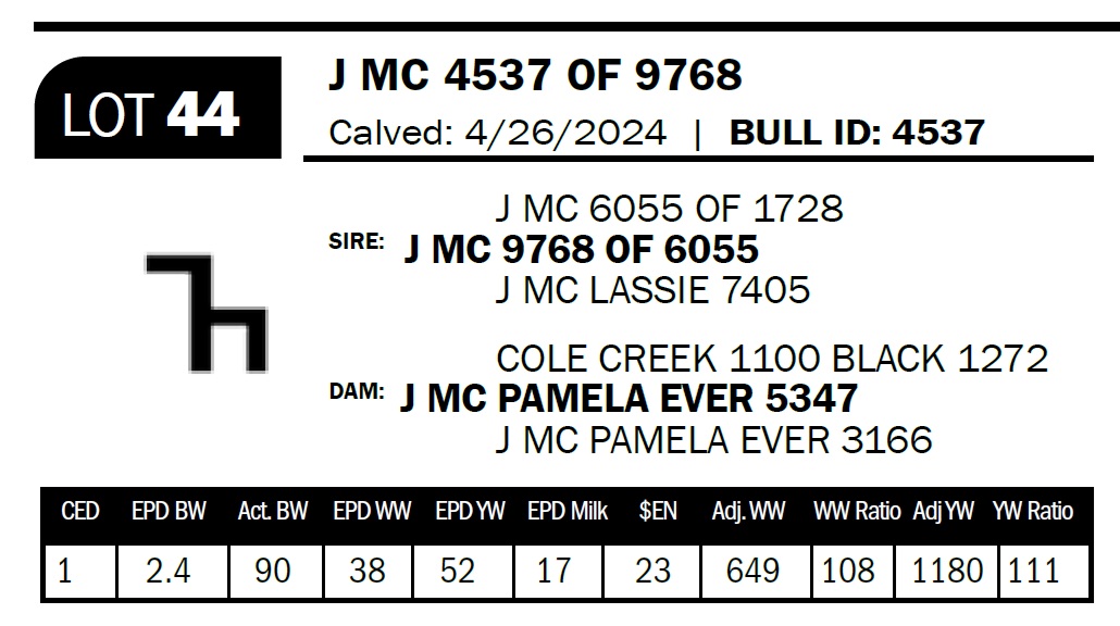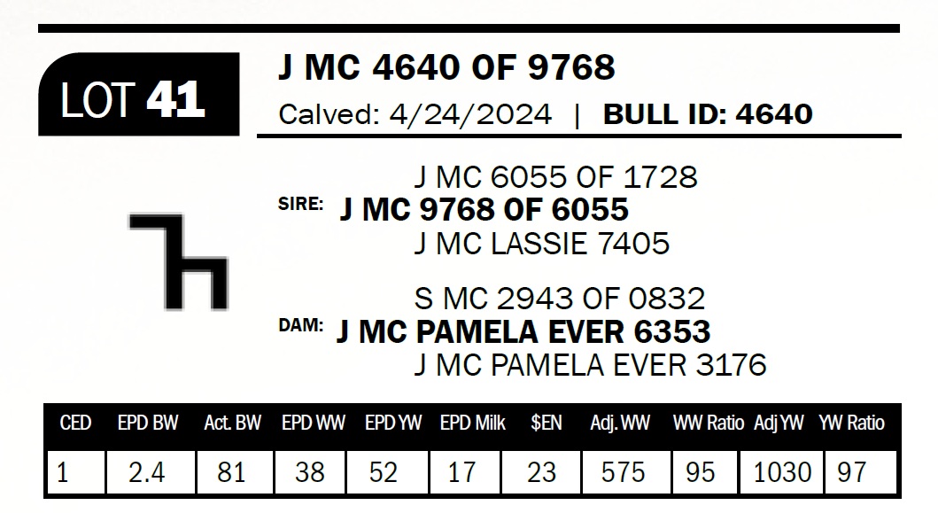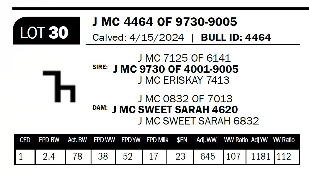 | J MC 4464 OF 9730-9005 | 30 | Two-Year Old Bull | This bull’s sire is a son of 4001 out of a Rebel Yell daughter, while his dam is a 7013 bred cow out of an Open Fire cow. She is a coming 12 yr old cow that’s never missed. |