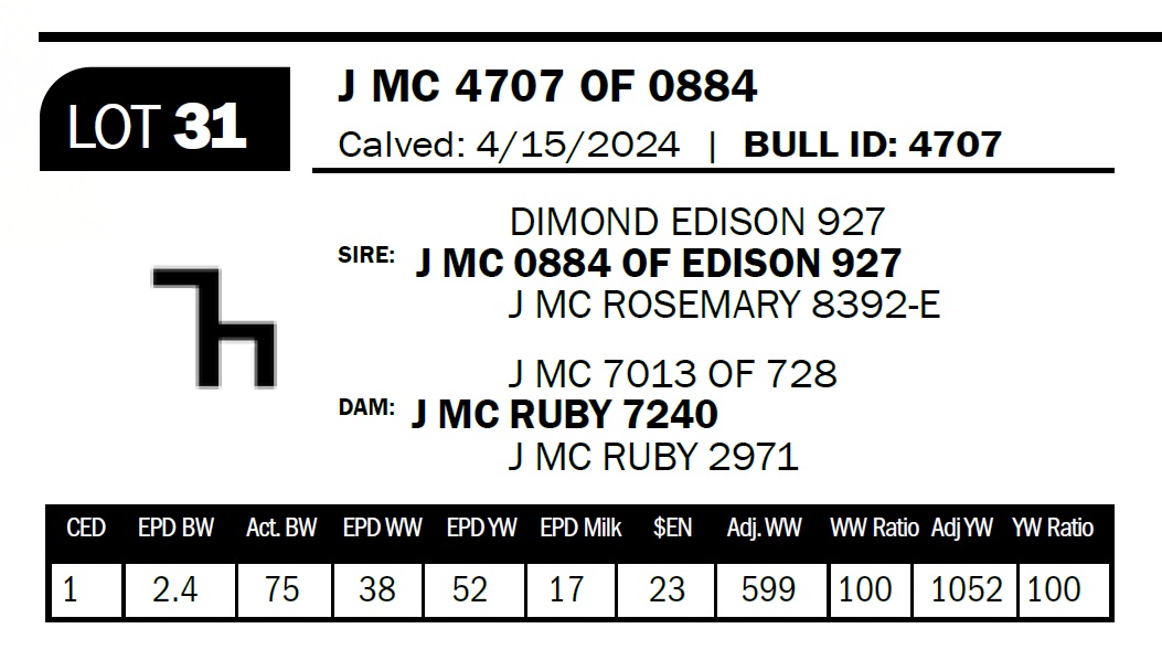 | J MC 4707 OF 0884 | 31 | Two-Year Old Bull | This bull is stacked with some of the best cows we've ever worked with. Several shots of the Ester 1116 cow along with the 832, Rosemary, Forever Lady, and the Ruby cows. There's so much maternal goodness and longevity in this bull. |