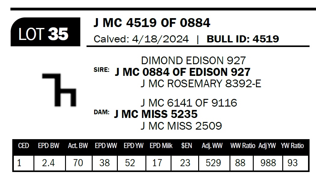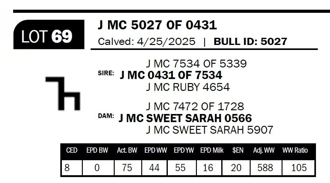 | J MC 5027 OF 0431 | 69 | Yearling Bull - NO VIDEO ON THIS LOT! | *** Calving ease bull. Dam has had four calves with an average birthweight of 73lbs. Bull is double bred 1126. |