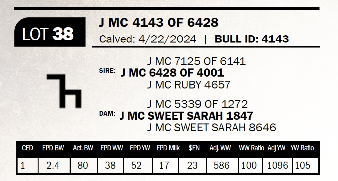 | J MC 4143 OF 6428 | 38 | Two-Year Old Bull | This bull's mother is quickly living up to her pedigree. Super nice made, very productive cow. She has a Black Mass 183 son that is a yearling that will probably stay here if he tests this spring. |