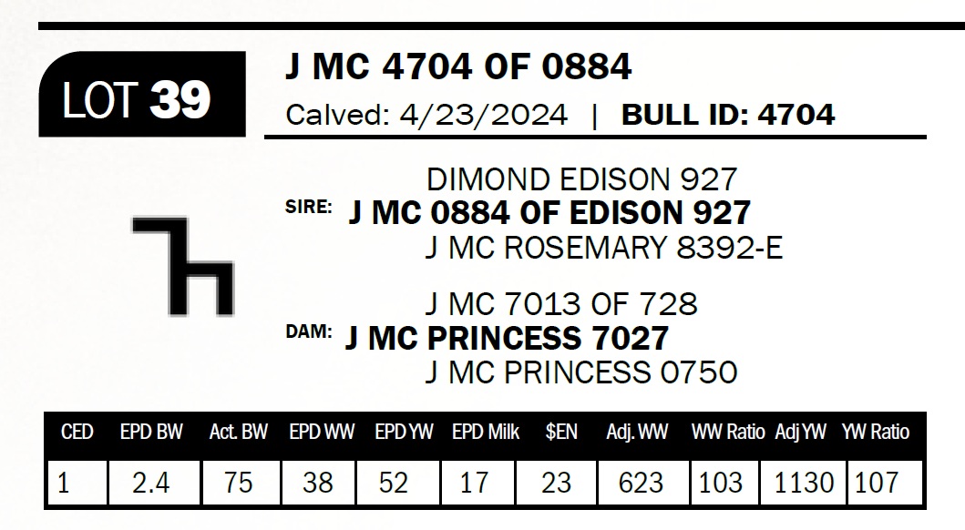 | J MC 4704 OF 0884 | 39 | Two-Year Old Bull | Here you go, Duke. The 704 cow is one of those cows that always produces a good calf. She's made just right and always gets her job done. |