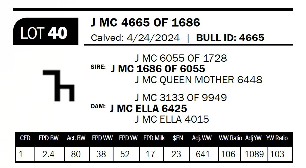 | J MC 4665 OF 1686 | 40 | Two-Year Old Bull | The mother to this bull is a coming 10 yr old cow that just never misses. He's double bred back to the old 1126 bred 208 bull. The 208 bull left us some outstanding daughters. |