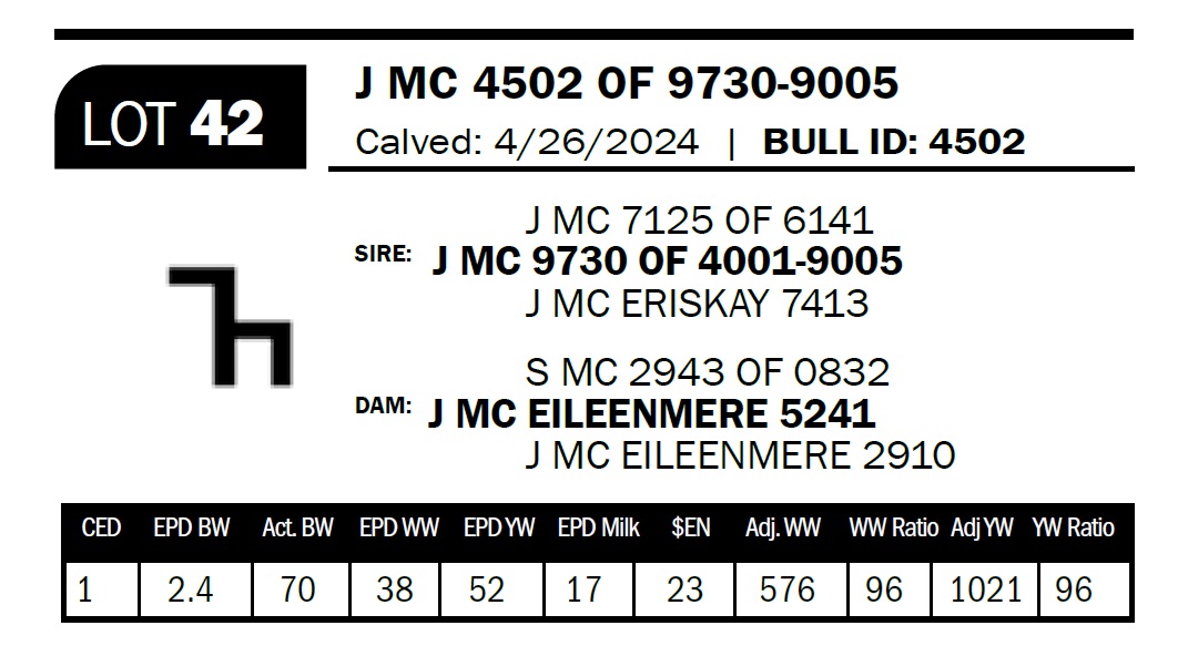 | J MC 4502 OF 9730-9005 | 42 | Two-Year Old Bull | Another nice 9005 son out of another “don't miss” 2943 daughter. 364 days a year they are the best we've ever bred, but they can be pretty protective when they calve. |