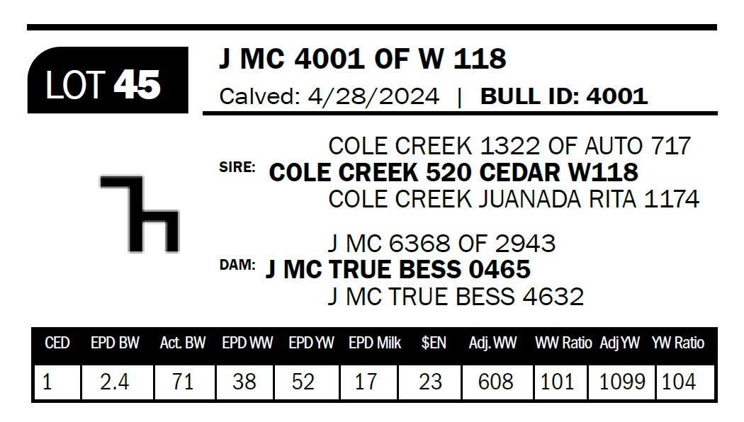 | J MC 4001 OF W 118 | 45 | Two-Year Old Bull | Out of the Cole Creek 520 bull and a double bred 0832 daughter, this bull offer some out cross to our 1116 pedigrees. He should sire a bunch of calves. The 520 bull is a warrior. |
