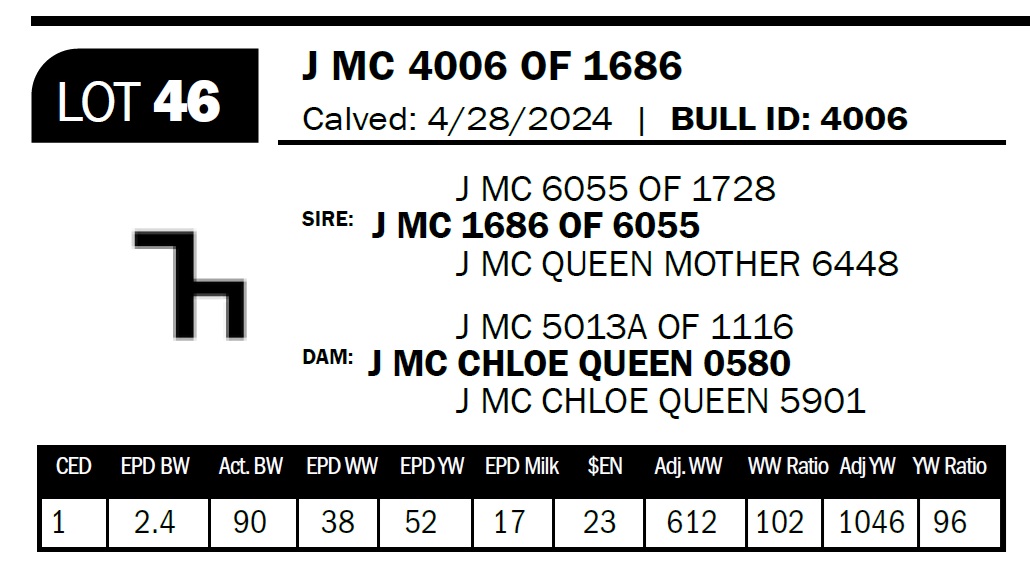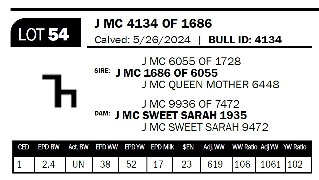 | J MC 4134 OF 1686 | 54 | Two-Year Old Bull | I would hate to jinx the mother to this bull, but she's really doing a nice job. Her fi rst calf was one of our high sellers in 2023. This bull is double bred top and bottom to our 1728 bull who has left a huge mark on our herd. We didn't get a BW on him. |