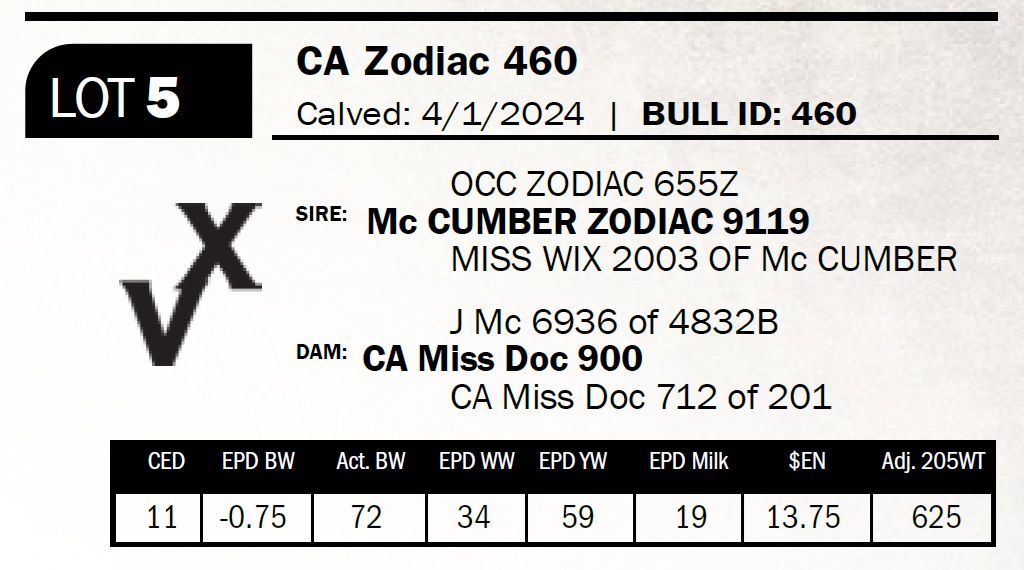 | CA Zodiac 460 | 5 | Two-Year Old Bull | *** Calving ease. Heifer bull. Long, balanced 9119 son with extra length and natural thickness. |