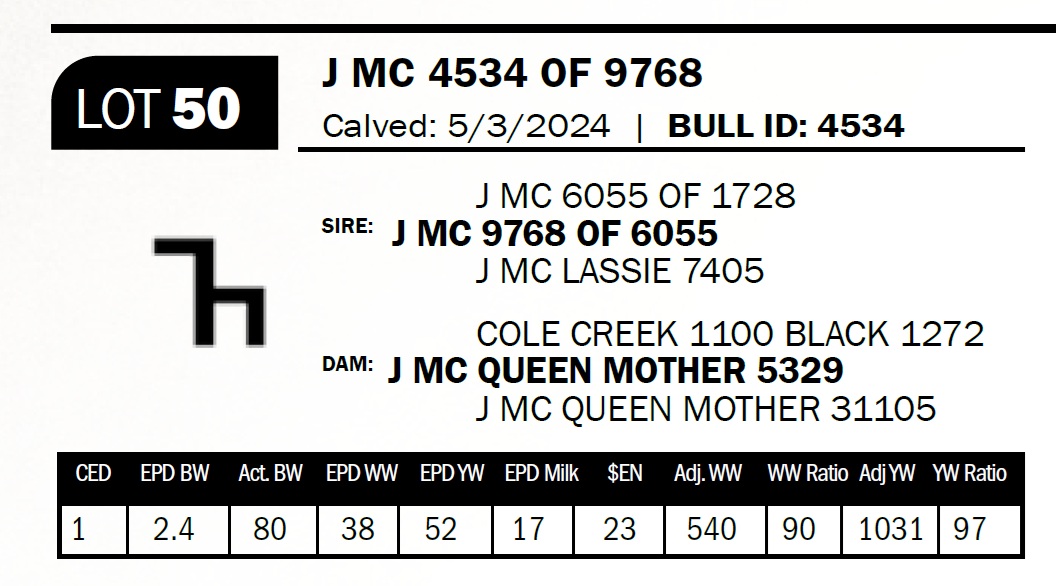 | J MC 4534 OF 9768 | 50 | Two-Year Old Bull | The mother to this bull is as phenotypically correct as any cow we own. She's as deep and broody as you can make one. She's a consistent producer that is always in good shape. |