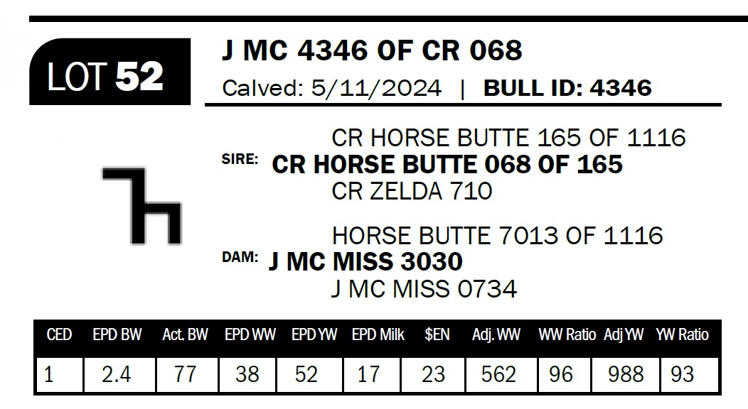 | J MC 4710 OF 1686 | 48 | Two-Year Old Bull | A super nice bull that's chocked full of the 1116 cow. When we started breeding to the Horse Butte bulls 20+ years ago, she was the cow we were focused on. His dam is a 7013 brother/sister mating. |