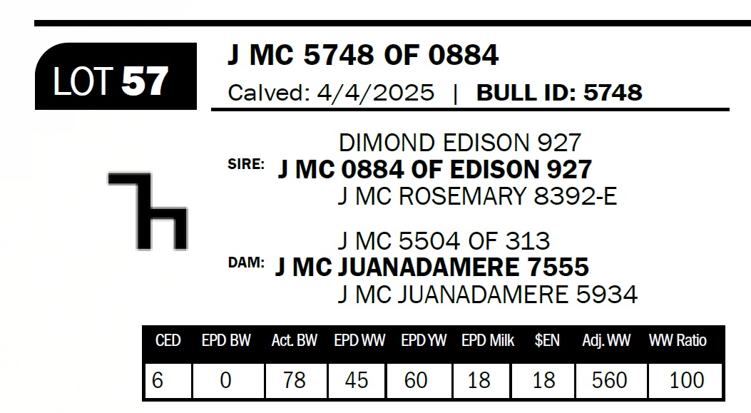 | J MC 5748 OF 0884 | 57 | Yearling Bull - NO VIDEO ON THIS LOT! | *** Calving ease bull. Dam has had seven calves with an average birthweight of 71lbs. Mother is a Beetseed out of a Juanada Lad bred cow. |