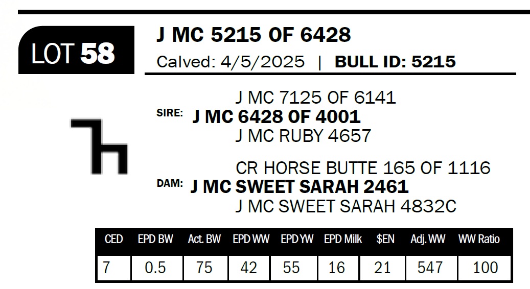 | J MC 5215 OF 6428 | 58 | Yearling Bull - NO VIDEO ON THIS LOT! | *** Calving ease bull. Dam has had two calves with an average birthweight of 73lbs and is a daughter of Cook’s 165 bull out of a Shoshone 121-6144 daughter. Granddam has had eight calves with an average birthweight of 79lbs. |