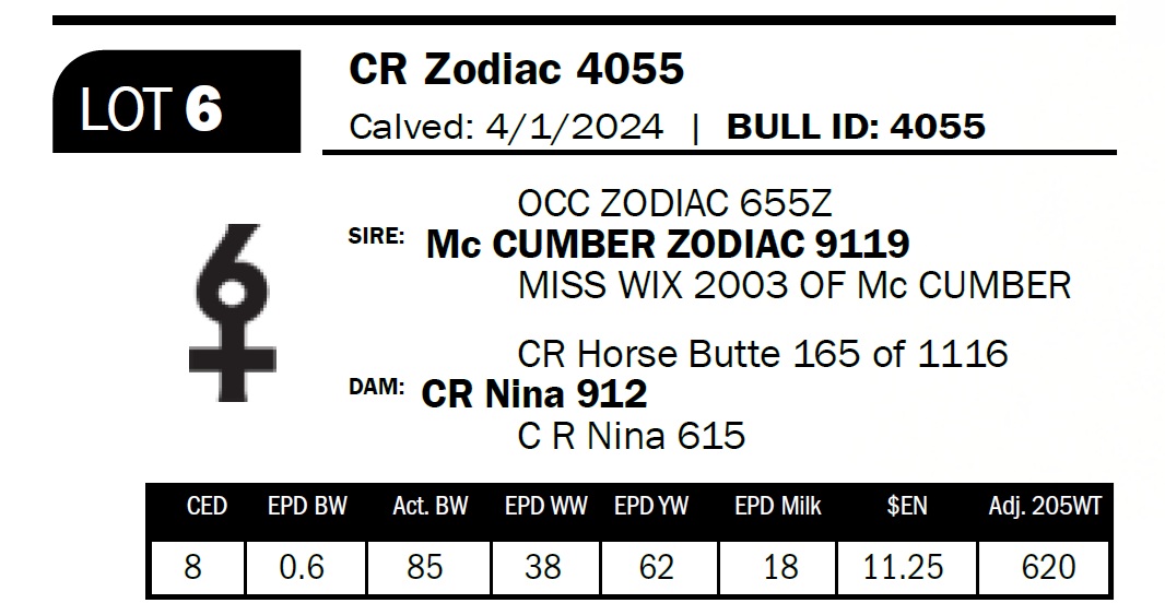 | CR Zodiac 4055 | 6 | Two-Year Old Bull | Outstanding 9119 son with herd bull potential. Longbodied and deep-sided, standing square and correct on all four corners. |