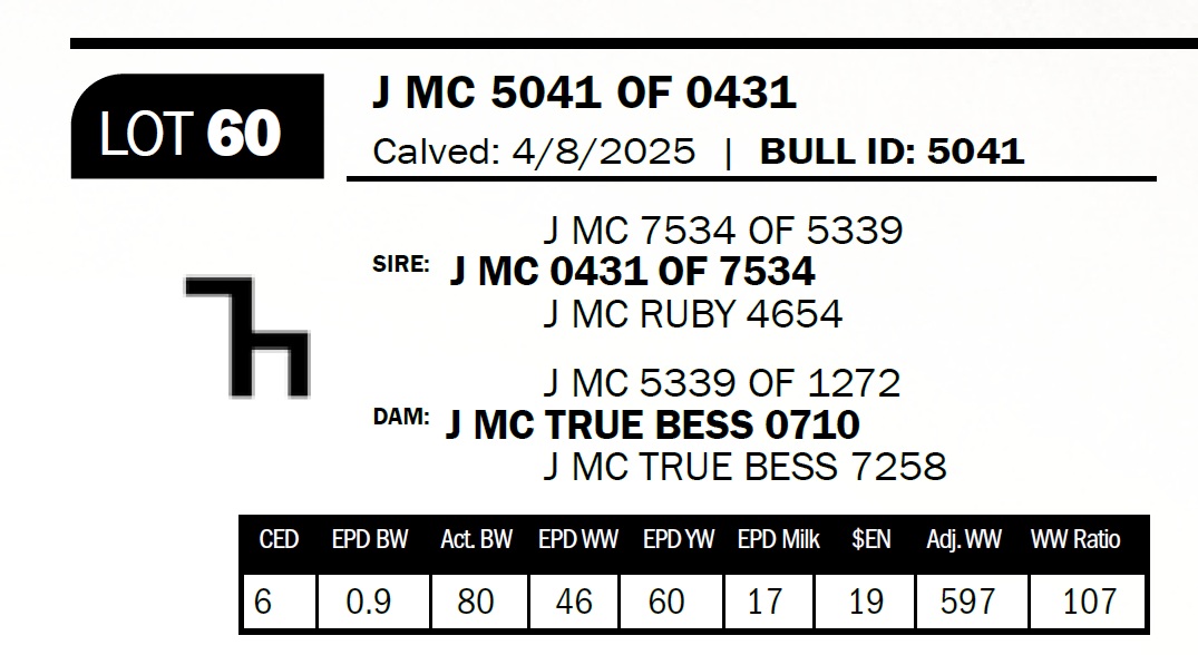 | J MC 5041 OF 0431 | 60 | Yearling Bull - NO VIDEO ON THIS LOT! | *** Calving ease bull. Dam has had four calves with an average birthweight of 78lbs. We kept a full brother to this bull last year. Double bred 1100 Black 1272. |