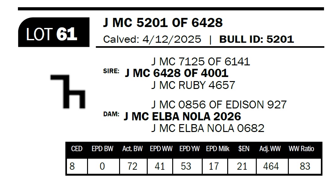 | J MC 5201 OF 6428 | 61 | Yearling Bull - NO VIDEO ON THIS LOT! | *** Calving ease bull. Dam has had two calves with an average birthweight of 59lbs. Granddam has had two calves with an average birthweight of 71lbs. Line bred 6141. |