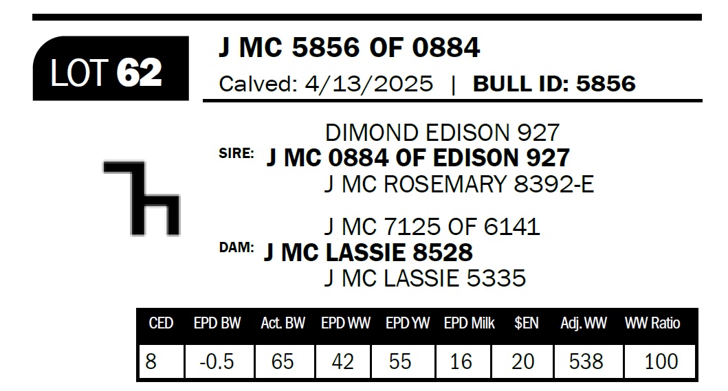 | J MC 5856 OF 0884 | 62 | Yearling Bull - NO VIDEO ON THIS LOT! | *** Calving ease bull. Dam has had six calves with an average birthweight of 73lbs. We kept a half brother to this bull to use on our heifers. Granddam was a beautiful cow. |