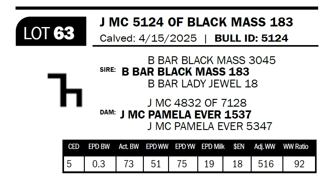 | J MC 5124 OF BLACK MASS 183 | 63 | Yearling Bull - NO VIDEO ON THIS LOT! | *** Calving ease bull. Dam has had three calves with an average birthweight of 74lbs. Granddam has had eight calves with an average birthweight of 78lbs. Only 3 stars on the 183 son’s until we have more information on him. |