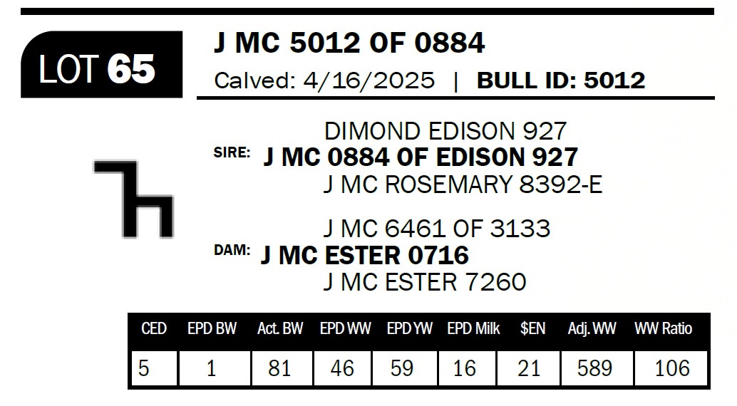 | J MC 5012 OF 0884 | 65 | Yearling Bull - NO VIDEO ON THIS LOT! | *** Calving ease bull. Dam has had four calves with an average birthweight of 77lbs. The mother to this bull is probably the prettiest cow we have. |
