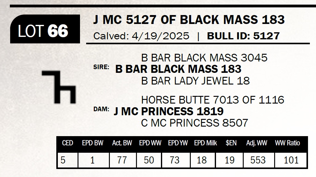 | J MC 5127 OF BLACK MASS 183 | 66 | Yearling Bull - NO VIDEO ON THIS LOT! | *** Calving ease bull. Dam has had 12 calves with an average birthweight of 76lbs. Mother to this bull is coming 15 and still going strong. I wonder how much Muggli cake she has eaten over her life time? |