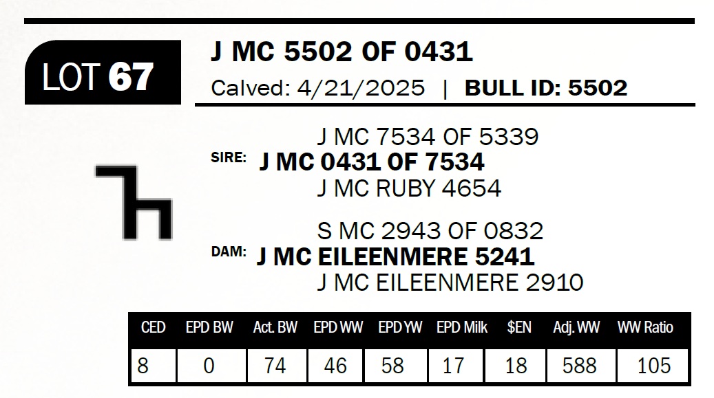 | J MC 5502 OF 0431 | 67 | Yearling Bull - NO VIDEO ON THIS LOT! | **** Calving ease bull. Dam has had nine calves with an average birthweight of 72lbs. Have I mentioned we really like the 2943 daughters? |