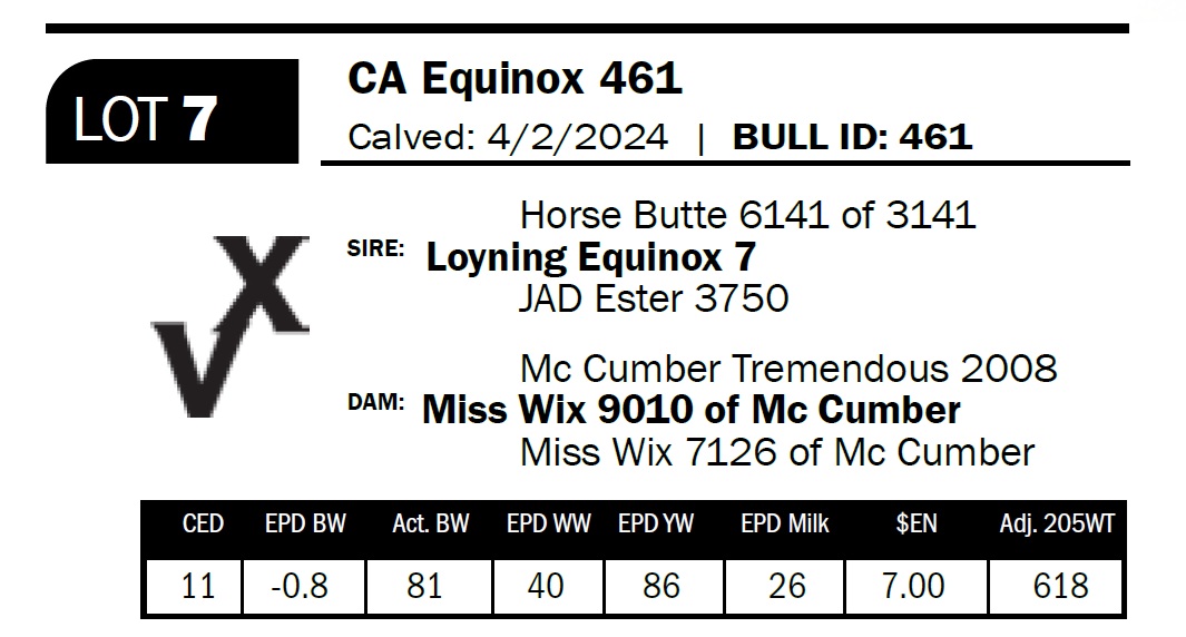 | CA Equinox 461 | 7 | Two-Year Old Bull | *** Calving ease. Long, stout, and deep-ribbed with a big hindquarter. Will add pounds to calves and produce strong, productive females. |