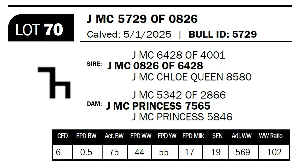 | J MC 5729 OF 0826 | 70 | Yearling Bull - NO VIDEO ON THIS LOT! | *** Calving ease bull. Dam has had six calves with an average birthweight of 79lbs. The Princess cows have always been a good calving ease cow family. |