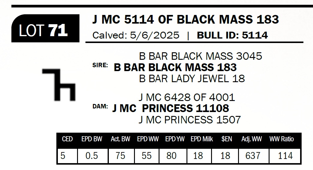 | J MC 5114 OF BLACK MASS 183 | 71 | Yearling Bull - NO VIDEO ON THIS LOT! | *** Calving ease bull. Dam has had three calves with an average birthweight of 68lbs. Granddam has had 10 calves with an average birthweight of 70lbs. A big stout 183 son out of a brother/sister 7013 bred cow. |