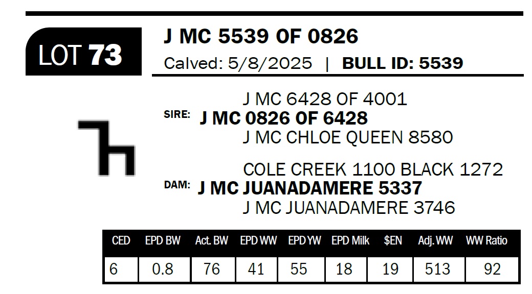 | J MC 5539 OF 0826 | 73 | Yearling Bull - NO VIDEO ON THIS LOT! | *** Calving ease bull. Dam has had nine calves with an average birthweight of 81lbs. She is a really pretty made 1100 Black 1272 daughter. Here you go, Greg. |