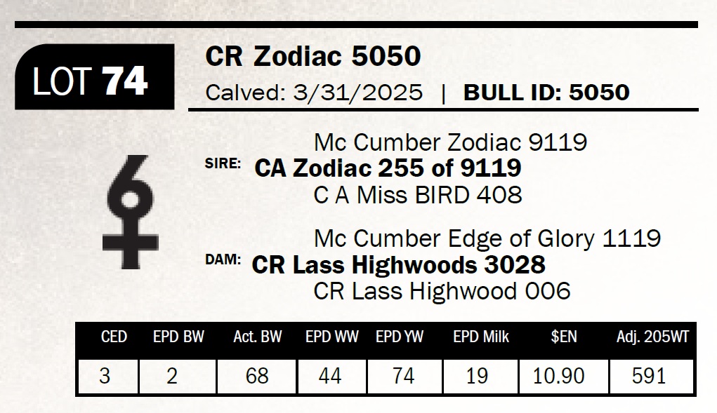 | CR Zodiac 5050 | 74 | Yearling Bull | *** Calving ease. 3-star heifer bull–well-balanced, complete, and smooth with nice expression throughout. |