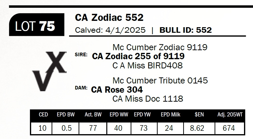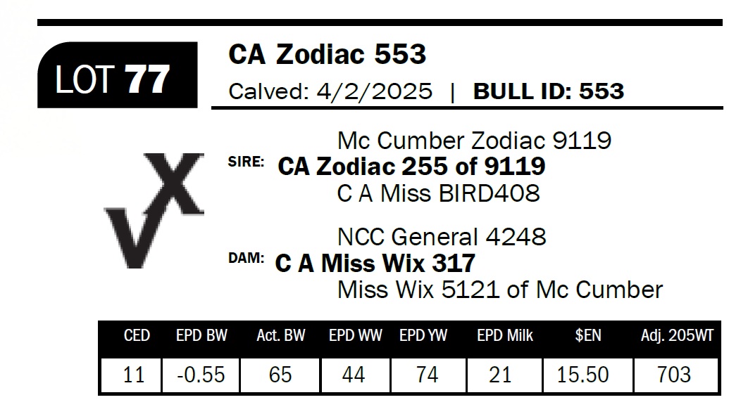 | CA Zodiac 553 | 77 | Yearling Bull | *** Calving ease. Sired by home-raised herd sire CA 255, 553 is balanced, clean-fronted, and a true heifer bull. |