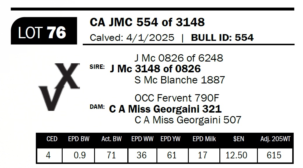 | CA JMC 554 of 3148 | 76 | Yearling Bull | ***Calving ease. Out of a fi rst-calf heifer. Her granddam is one of my all-time favorite cows and a donor in our ET program. She'll calve this spring at 15 years old. |