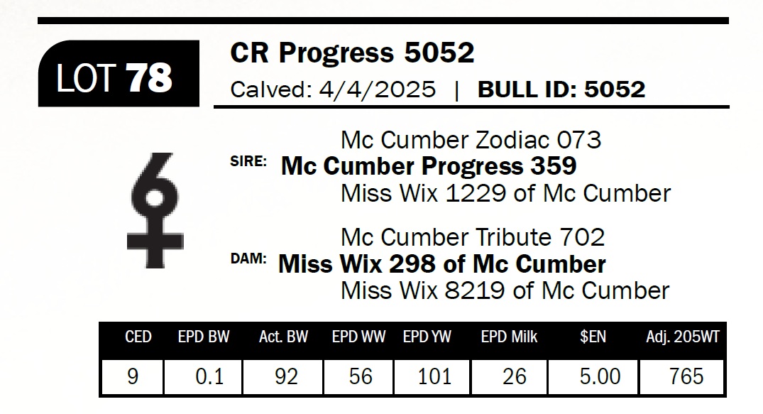 | CR Progress 5052 | 78 | Yearling Bull | Cow bull–out of a cow from the McCumber program. Powerful calf with good bone and a strong hindquarter. |