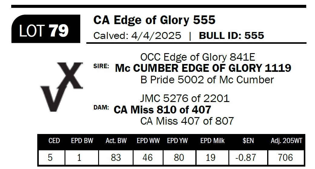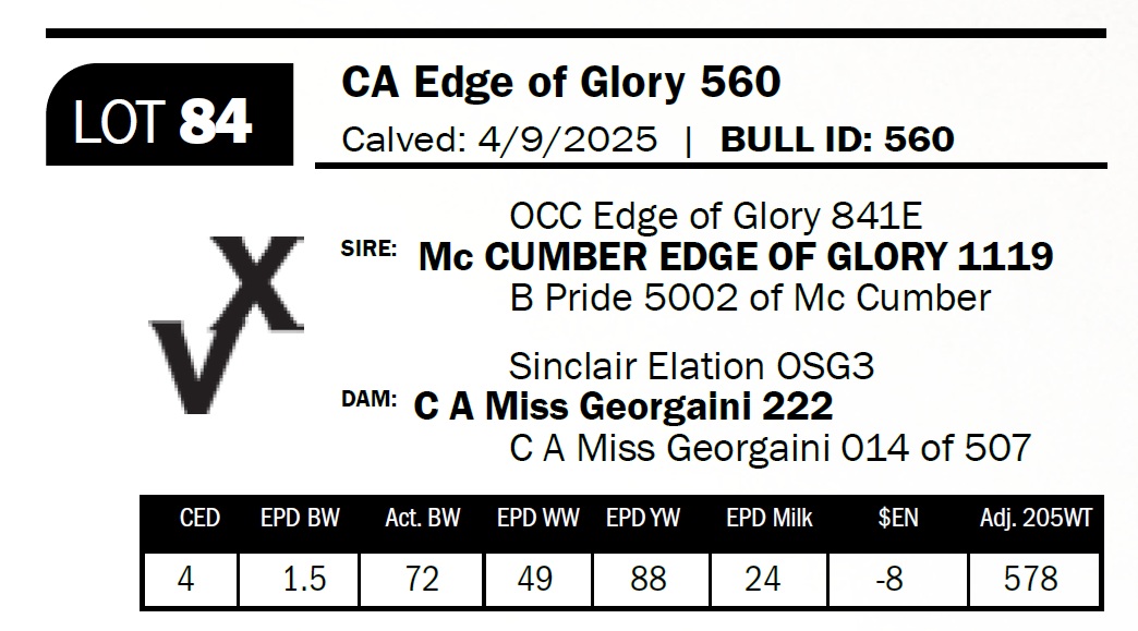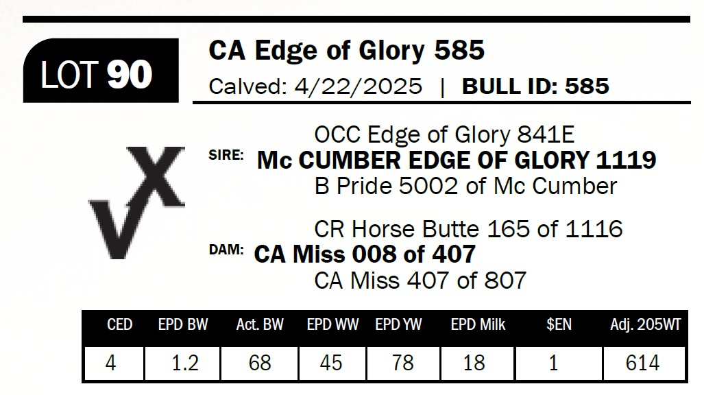 | CA Edge of Glory 585 | 90 | Yearling Bull | Sells Commercial. Cow bull–loads of volume and depth. Out of a super nice, coming six-year-old cow. |